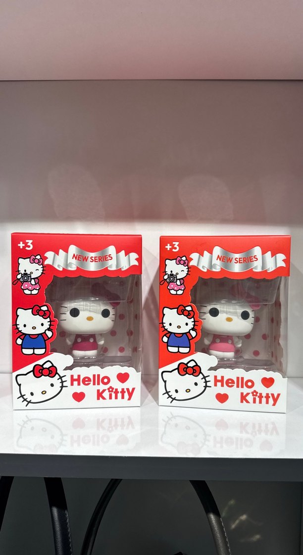 Renkli Hello Kitty aksiyon figürü, pembe kıyafetli, 3 yaş ve üzeri için uygundur. Kutusunda 'New Series' yazısı bulunur.