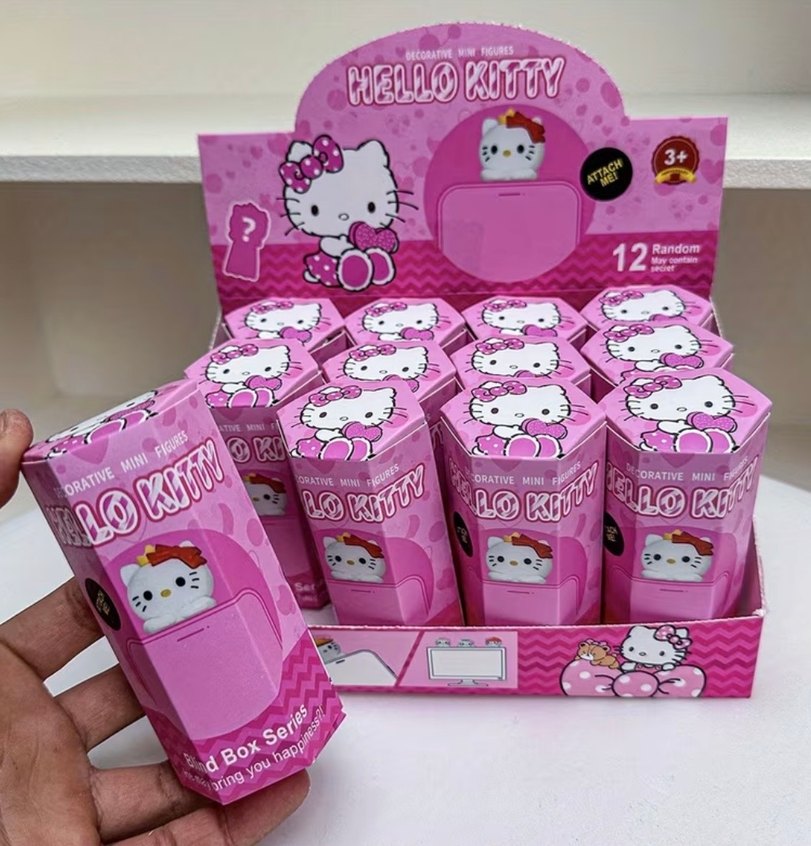 Renkli pembe kutularda 12 farklı rastgele Hello Kitty mini figürler. çocuklar için uygundur.