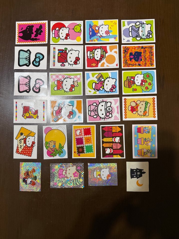 Çeşitli çizgi film karakterleri ve desenler içeren renkli çocuk yapbozu kartları, Hello Kitty dahil. Her kart canlı ve eğlenceli illüstrasyonlar sunar.