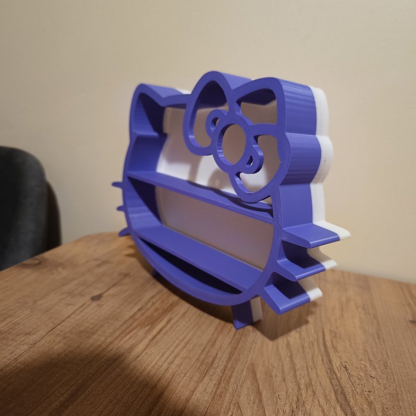 Hello Kitty tasarımlı, mor çocuk rafı. Çocuk odaları için hem şık hem kullanışlı depolama sağlar.