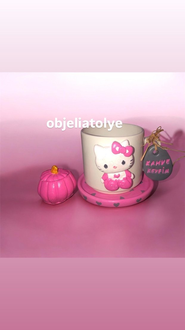 Su bazlı verniklidir istenilen renk model yapılır kupa porselendir yazı yazılır isim yazılır Pastel pembe renkte, Hello Kitty figürlü seramik kupa, uyumlu tabak ve küçük süs balkabağı ile birlikte. Üzerinde 'KAHVE KEYFIM' yazılı etiket bulunur. ☕