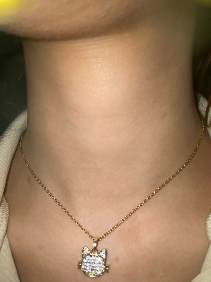Günlük kullanım ve rahat sokak stili için parlak kedi figürlü, zincir detaylı altın renkli kolye.