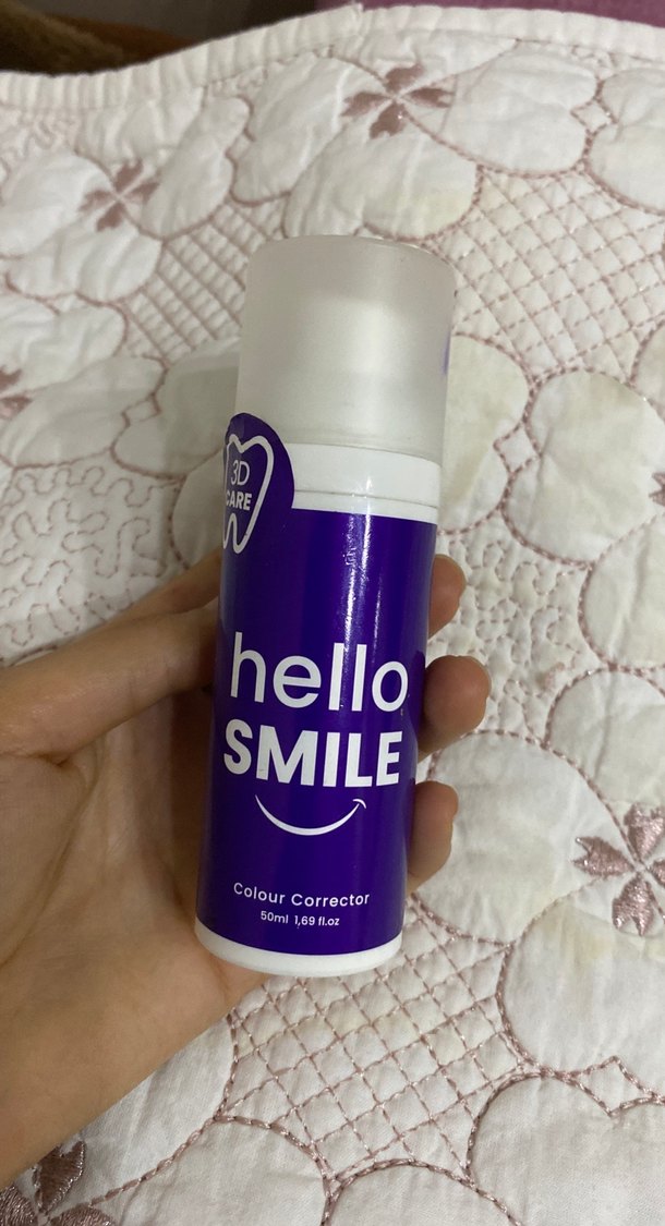 Hello Smile Renk Düzeltici diş macunu, 50 ml boyutunda, mor ve beyaz tasarıma sahip. Diş rengini düzeltmeyi amaçlar.