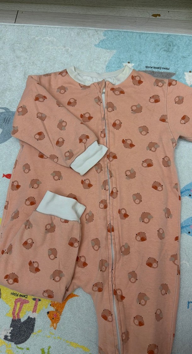 Kız çocukları için uzun kollu, bisiklet yaka ve fermuarlı pijama. Yumuşak ve sıcak kumaştan, pastel kahverengi üzerine kuş desenli. Yakası sarı lekeli