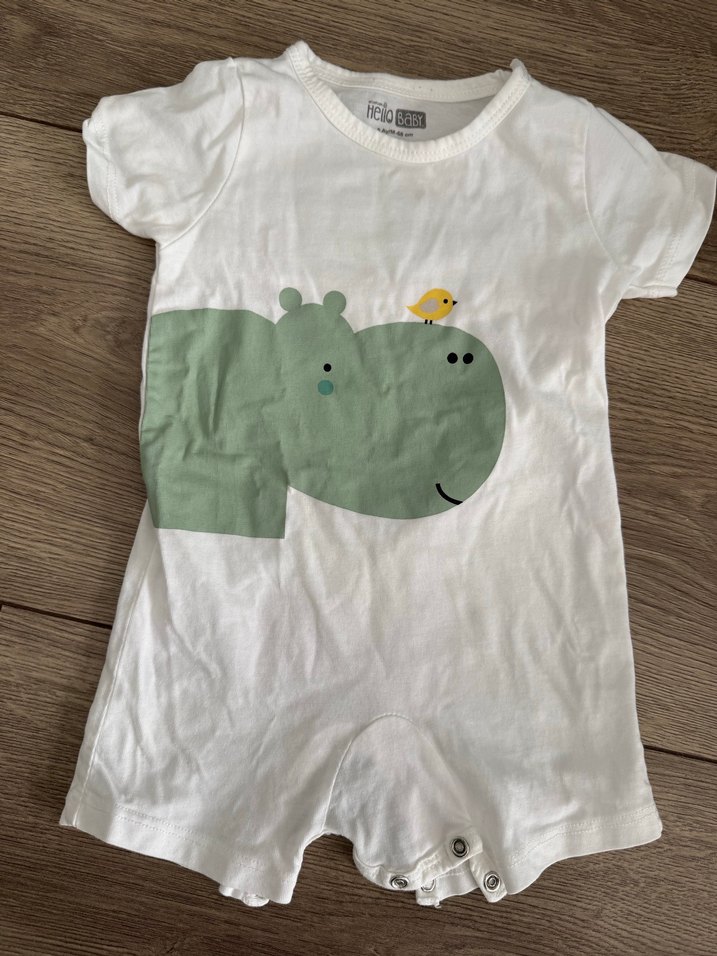 Kısa kollu, yuvarlak yakalı pamuklu bebek tulumu, beyaz renkte ve yeşil bir su aygırı ile sarı kuş baskılıdır. Rahat ve şık bir seçimdir.