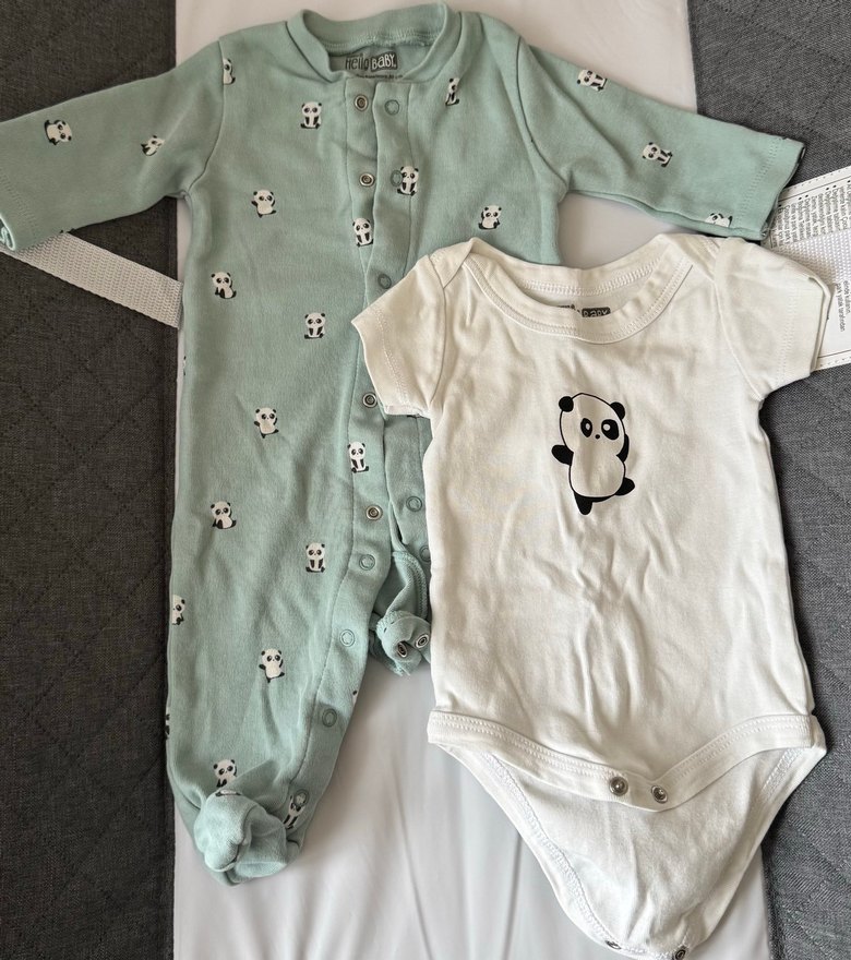 Bebek erkek pamuklu kumaştan, panda baskılı uzun kollu tulum ve beyaz kısa kollu panda baskılı body seti.