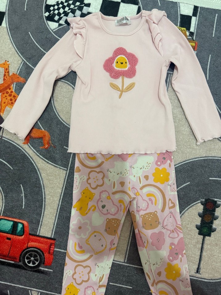 Pembe uzun kollu üstü fırfırlı ve gülen çiçek baskılıdır. Altı pastel tonlarda, sevimli hayvan ve çiçek desenleriyle tamamlanmıştır. Geçen kış sonunda almştm sayılı giyildi görseldeki gibidir