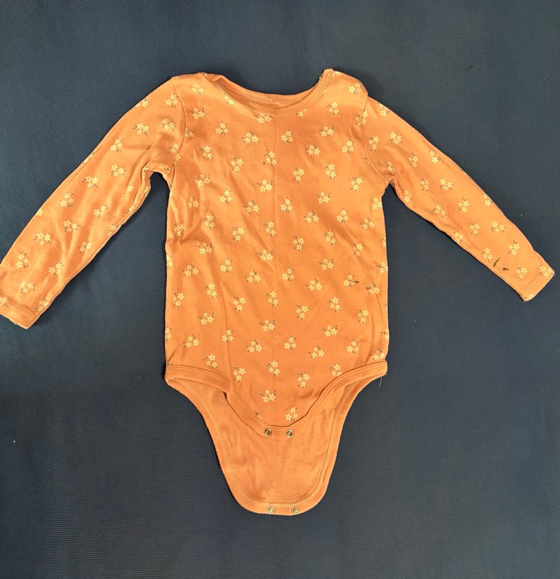 Pastel renkli, uzun kollu, çıtçıtlı bebek kız body. Yumuşak kumaş ve küçük çiçek desenleri içerir. Not: Fotoğrafta da görüleceği üzere çok az lekesi bulunuyor belki doğru ürünle çıkabilir bile.