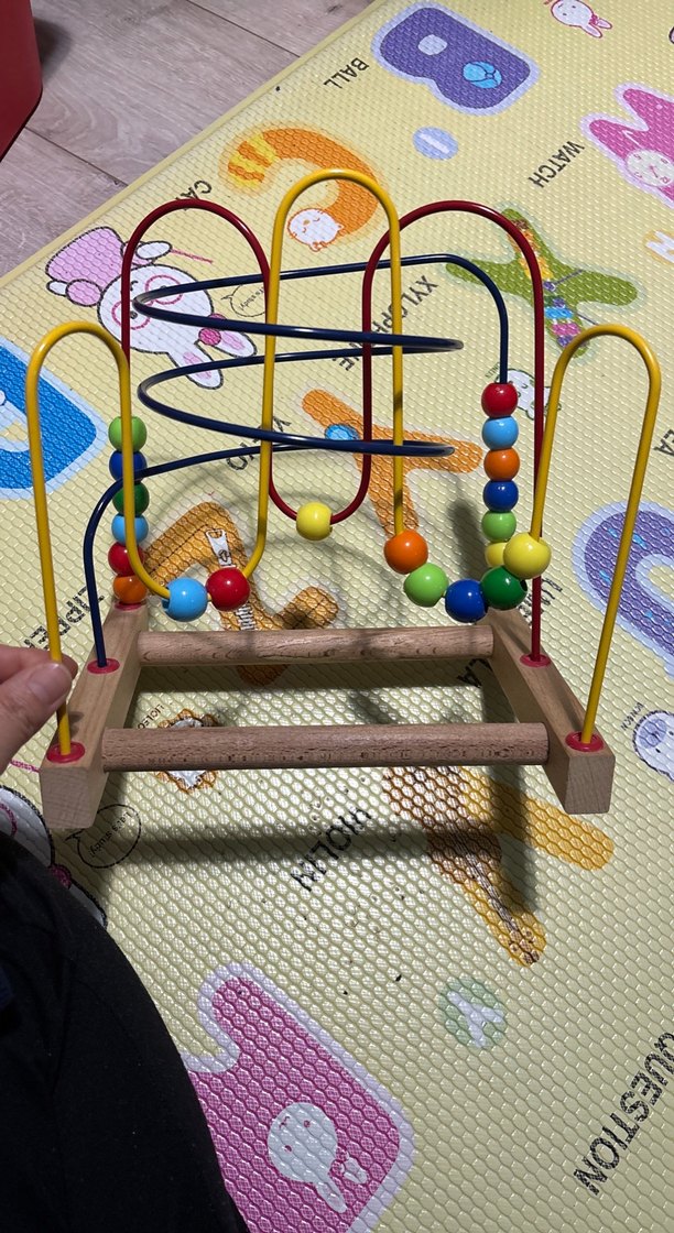 Renkli boncukların tellerde hareket ettiği, ince motor becerileri geliştiren ahşap eğitici oyuncaktır.