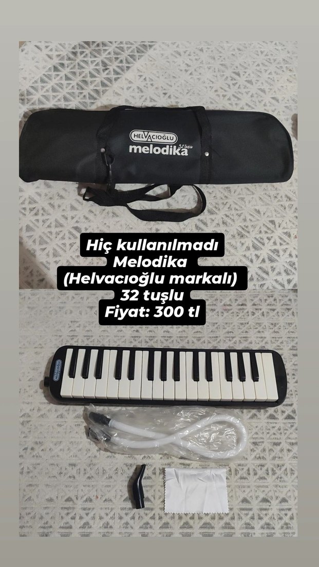 Kullanılmamış Helvacıoğlu markalı 32 tuşlu siyah melodika, taşıma çantası ve aksesuarlarıyla birlikte. Fiyat: 300 TL