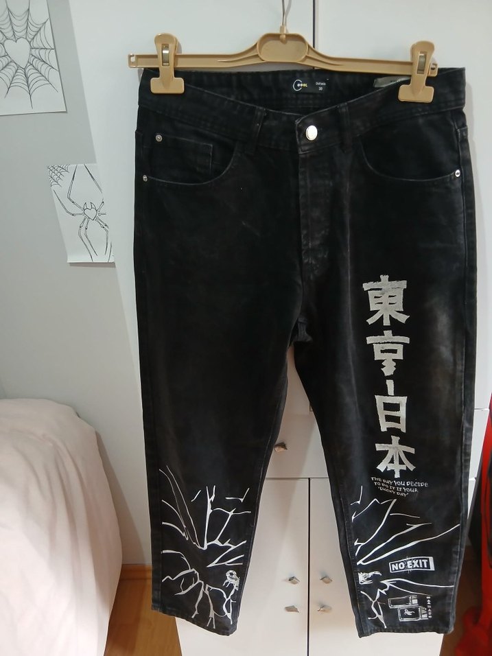 unisex ürün olduğu icin beden 30 yazıyor .Baskılı detaylara ve japon tarzi siyah, gevşek kesim kadın kot pantolon. Günlük kullanıma uygun sokak tarzı grafikler içerir.