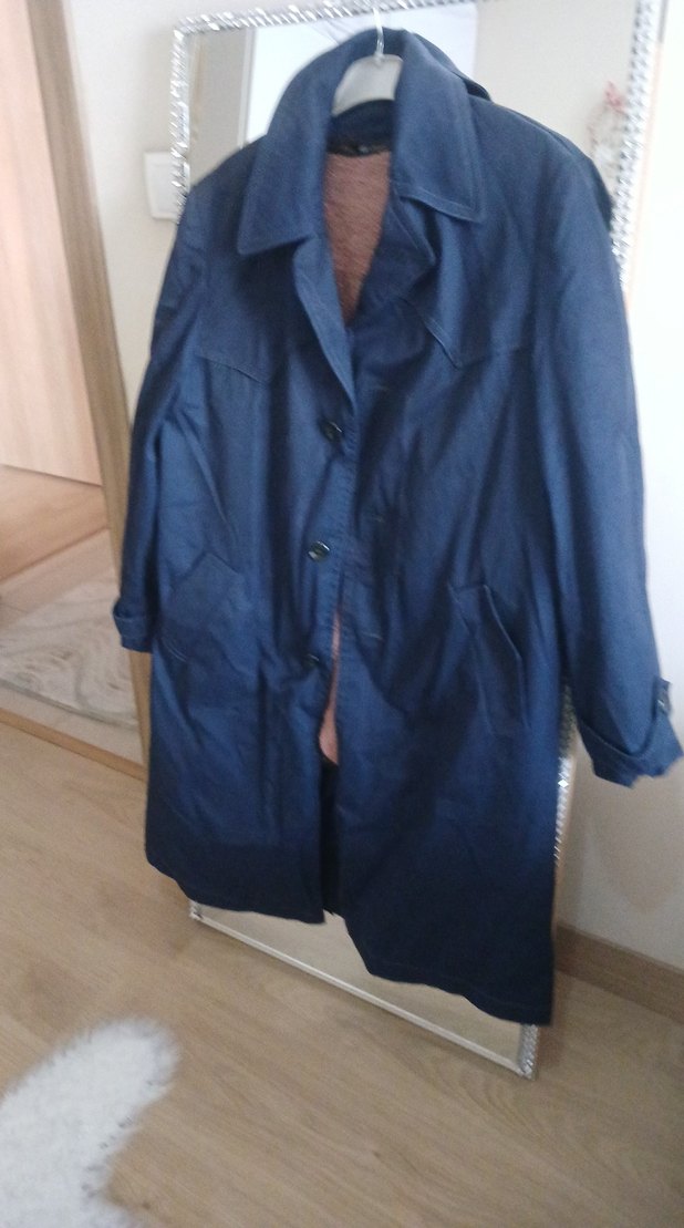 Lacivert renkli, düğmeli, notalı yaka ve uzun kollu bol kesim büyük beden yurt dışı ürünüdür fermuarlı poları ile hem kışın giyilebiliyor boydan astarı ile trençkot olarak da giyilebiliyor iki kol arası 69 cm boy 112 cm