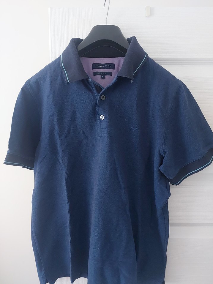 Hemington Marka Lacivert renkli, pamuk kumaşlı erkek polo yaka tişört. Düğmeli, kısa kollu ve regular fit kesime sahiptir. Günlük rahat kullanım için uygundur. M beden. Az kullanılmış. Temizdir.