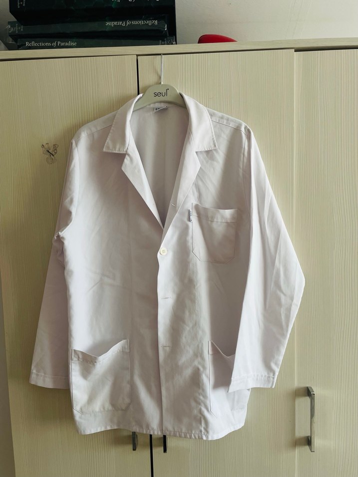 Beyaz, düğmeli hemşire/ebe/doktor önlüğü, kesik yaka ve uzun kolludur. Pamuk kumaştan, normal kesim ve midi boydadır, günlük kullanıma uygundur.