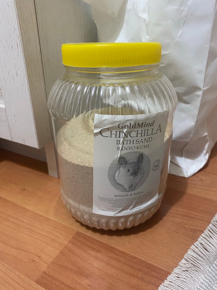 GoldMind markalı, bej renkte Chinchilla banyo kumu. Şeffaf kutuda ve sarı kapaklı, küçük hayvan banyosu için uygun bir üründür.