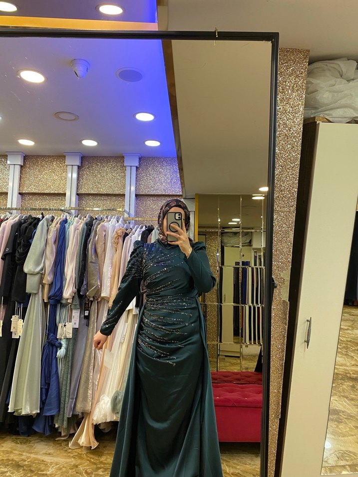 Yüksek yakalı, uzun kollu, nakış detaylı siyah abiye elbise. Drapeli tasarımı ve regular fit kesimiyle mütevazı ve şık bir görünüm sunar.