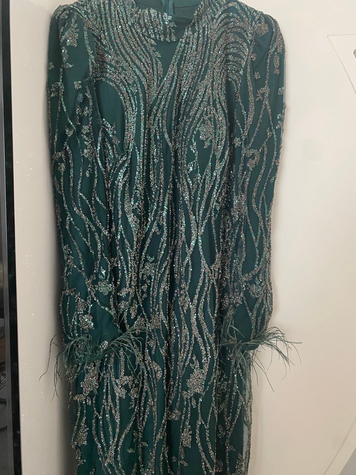 Koyu yeşil renkte, nakış işlemeli ve kol detaylarında tül bulunan uzun vücuda oturan abiye elbisedir. Düğün için uygundur. Çok güzel ve şıktır boncukludur kemeri ve 3.5 mt janjan şalıda mevcuttur ✨