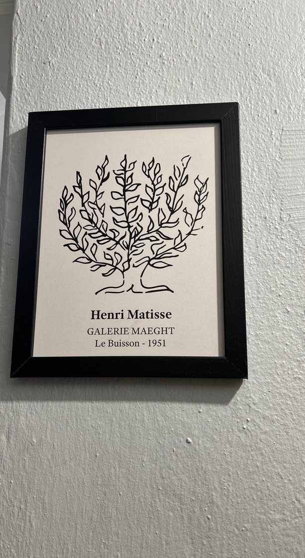 Bej arka plan üzerinde siyah çizgiyle bitki çizimi ve 'Henri Matisse GALERIE MAEGHT Le Buisson - 1951' yazılı siyah çerçeveli sanat baskısı. 30x40