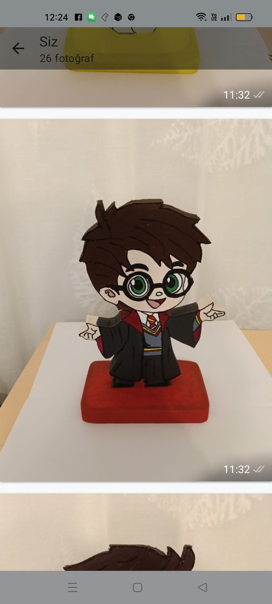 Kahverengi saçlı, büyük yeşil gözlü ve gözlüklü aksiyon figürü, siyah cübbe ve kırmızı-sarı çizgili kravatla, kırmızı kaide üzerinde duruyor. ⏰