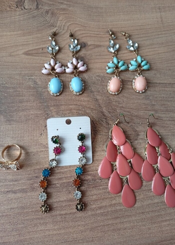 Renk renk küpeler salkım olan somon renkli six marka, bir adette yüzük var toplu fiyattır tek sıra uzun olan küpe Yok şu anda ,o yüzden indirim yaptım fiyatta