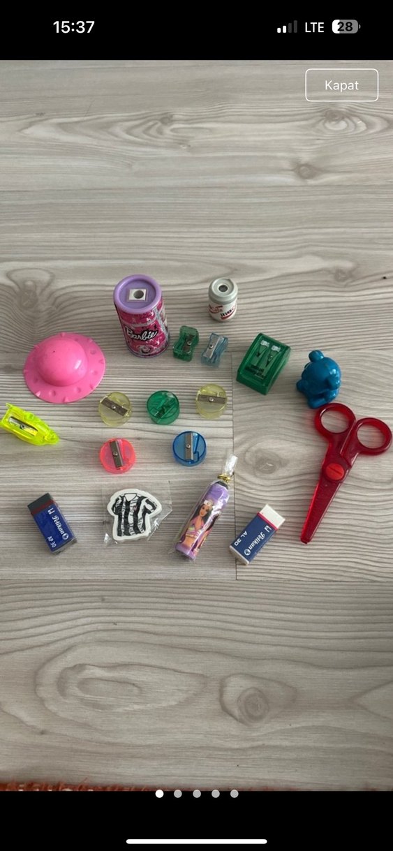 Çeşitli kalemtraşlar, silgiler ve küçük kırmızı makas içeren renkli okul etkinlik malzemeleri seti. ️