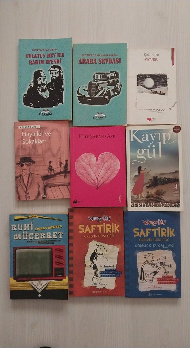 Felatun Bey ile Rakım Efendi, Araba Sevdası, saftrik serisi, kayıp gül, ruhi mücerret, hayaller ve sokaklar, elif şafak aşk, Piyango gibi çeşitli Türkçe edebiyat kitaplarından oluşan set. Farklı yazarların eserleri ve temaları içerir.