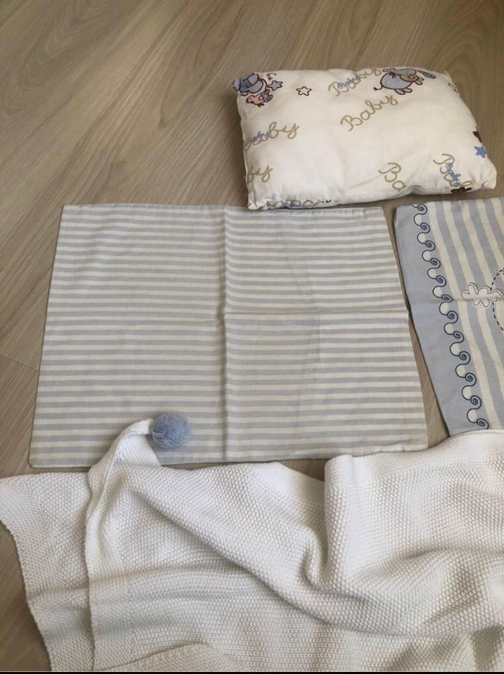 Nakışlı desenli beyaz yastık, gri çizgili tekstil matı ve ponpon detaylı dokulu beyaz battaniyeden oluşan bebek uyku seti. ️