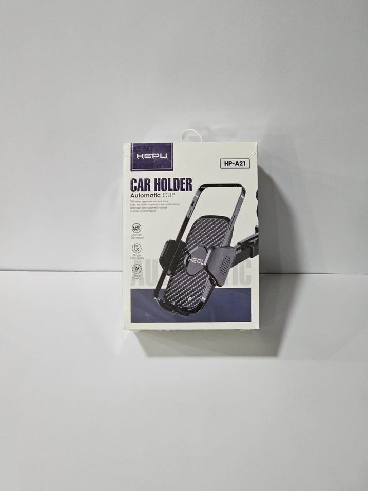 HEPU marka HP-A21 model siyah ve gri renklerde, otomatik klipsli sağlam telefon tutucu. Araç içinde güvenli telefon yerleştirmeye uygundur.