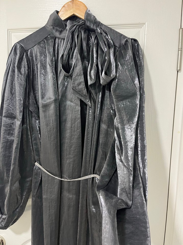 Gri renkte drapeli uzun elbise. Salaş kesimi ve zarif kemeriyle avant-garde tarzını yansıtır.