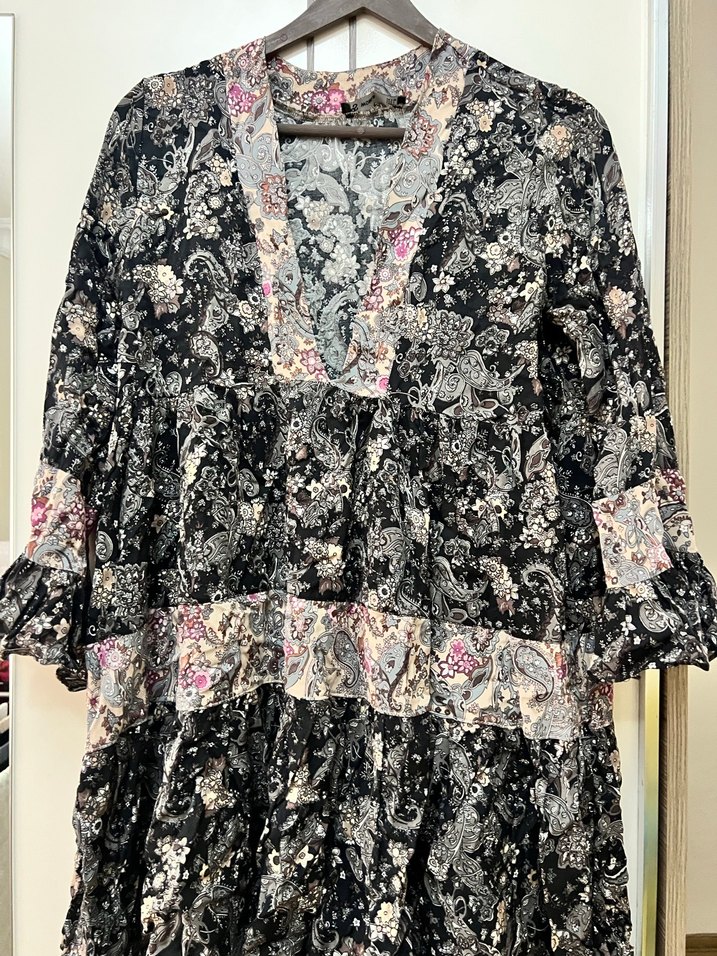 Çiçek desenli, uzun ve bol kesim elbise, volan detaylı ve V yakalıdır. Uzun kollu, bohem tarzda, günlük kullanıma uygundur.