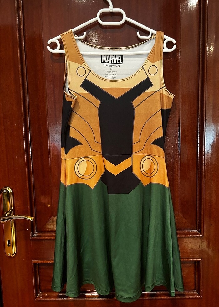 her universe markalı loki elbise. dikiş kusurlarını yakınlaştırarak ekledim. esnek kumaşlıdır. casual cosplay için giymiştim iki kere. #cosplay #loki #marvel #thor #hottopic #heruniverse