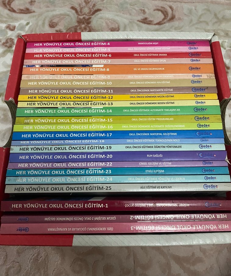 Okul öncesi eğitimin farklı yönlerini ele alan, dil gelişimi, yaratıcılık ve aile katılımı gibi konuları içeren 25 renkli kitaptan oluşan set. Hiç kullanılmadı üniversite zamanımda almıstım