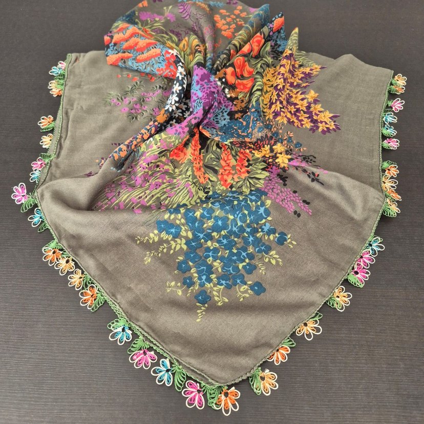 toplu alımlarda indirim vardir.!!!! Gri zemin üzerine canlı çok renkli çiçek desenleri ve zarif dantel detaylarıyla bohem tarzda kadın fuları.
