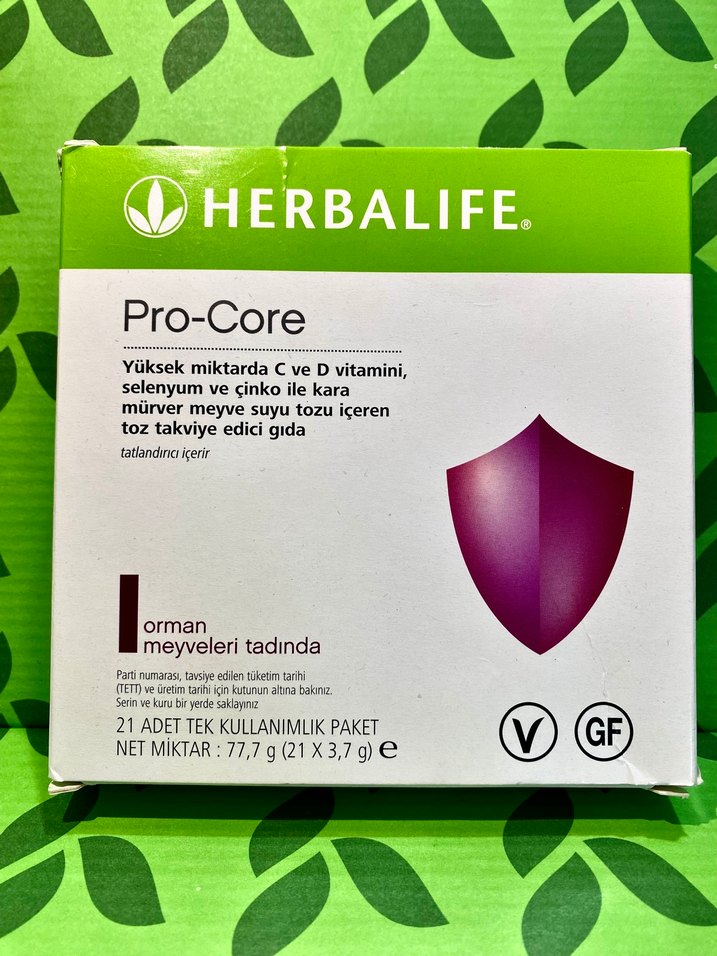 Herbalife Pro-Core, yüksek miktarda C ve D vitamini, selenyum ve çinko ile kara mürver meyve suyu tozu içerir. 21 adet tek kullanımlık paket, orman meyveleri tadında.