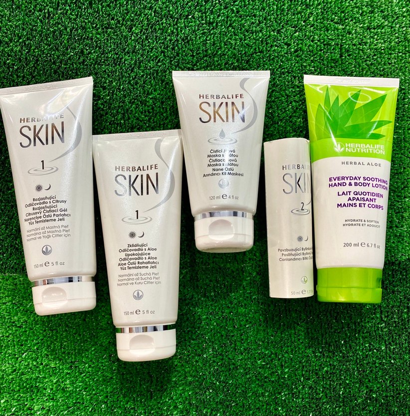 Herbalife Skin seti, doğal özler içeren temizleyici jel, maske ve el kremi ile cilt bakımı sağlar.