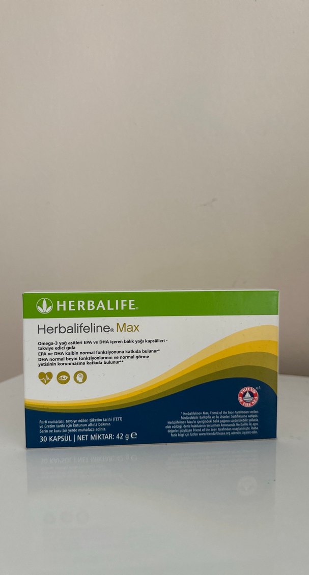 Herbalifeline Max, EPA ve DHA içeren omega-3 balık yağı kapsülleriyle beyin fonksiyonlarını ve görmeyi destekler. 30 adet, 42 gramlık kutuda.