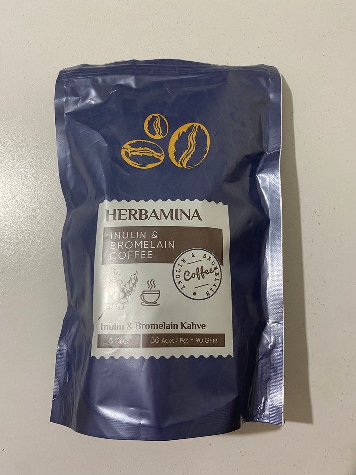 Herbamina İnulin & Bromelain kahve tozu, koyu kahverengi renkte. 30 porsiyonluk, inulin ve bromelain içeren özel karışım. ☕