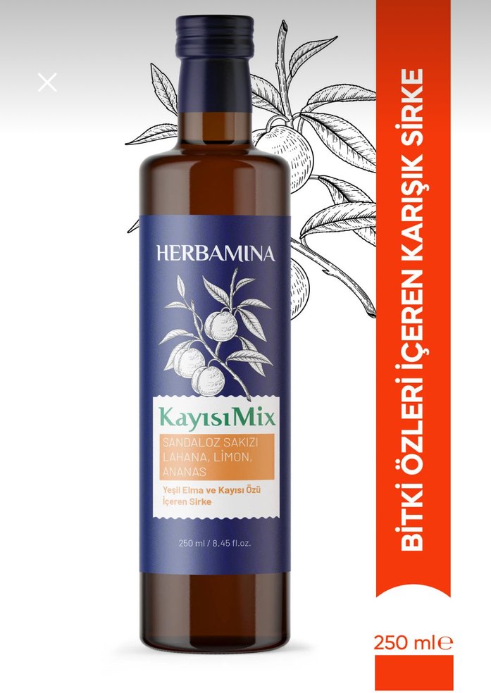 Herbamina Kayısı Mix Sirke, sandal ağacı, sakız, lahana, limon ve ananas gibi bitkisel özler içerir. Yeşil elma ve kayısı özü ile 250 ml şişede sunulur. Zayıflamaya yardımcıdır. Ürünü aldığımda hamile olduğumu öğrendim bu yüzden buradan satış yapıyorum.