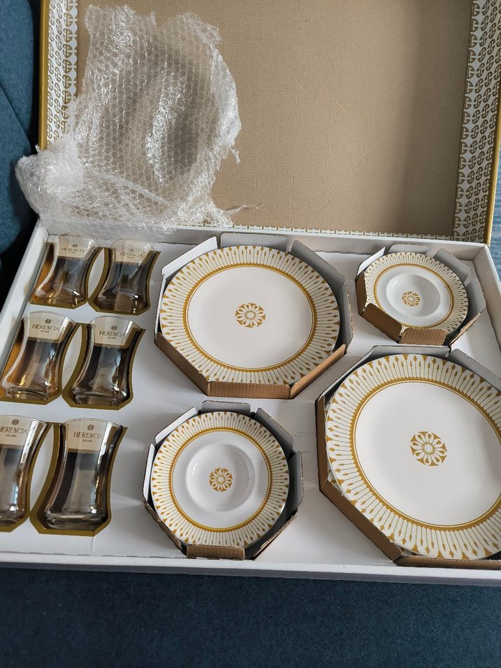 Altın desenli beyaz 6'lı çay bardağı ve altın detaylı beyaz tabaklardan oluşan set. Şık ve klasik tasarım çay keyfinizi artırır. ☕18 parça sıfır kutulu.