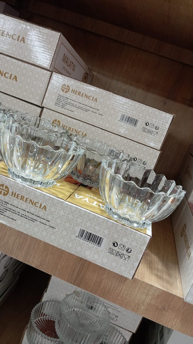 Herencia markalı, dalgalı kenarlı şeffaf cam kaselerden oluşan set. Tatlı veya atıştırmalık sunumu için uygundur. ️