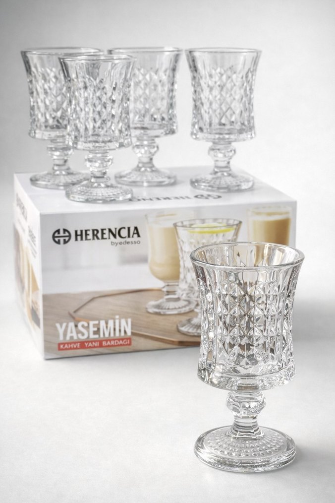 Herencia Yasemin desenli kahve yanı bardakları, sağlam tabanlı ve şık tasarımlı set halinde sunulur. Kutusunda marka adı yer alır. ☕
