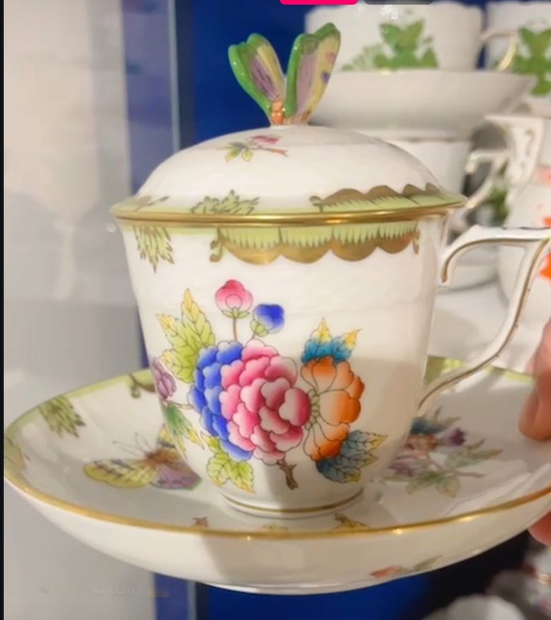 Pastel renkli çiçek desenleri ve kelebek şeklinde kulplu kapaklı porselen fincan, altın detaylarla süslenmiştir. ☕Hatasız kolleksiyonluk antika damga.