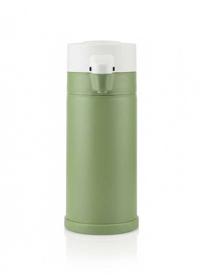 Haki renkte, çocuklar için tasarlanmış termos şişe, beyaz kapaklı ve kolay tutulabilir kompakt yapıda.
