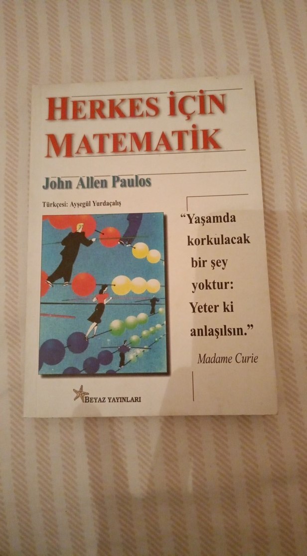 John Allen Paulos'un "Herkes İçin Matematik" kitabı, yaşamda korkulacak bir şey olmadığını anlatarak matematiği anlaşılır şekilde sunuyor. Yaklaşık 170 sayfa. Yapraklar dağınık değil, okunabilir haldedir.