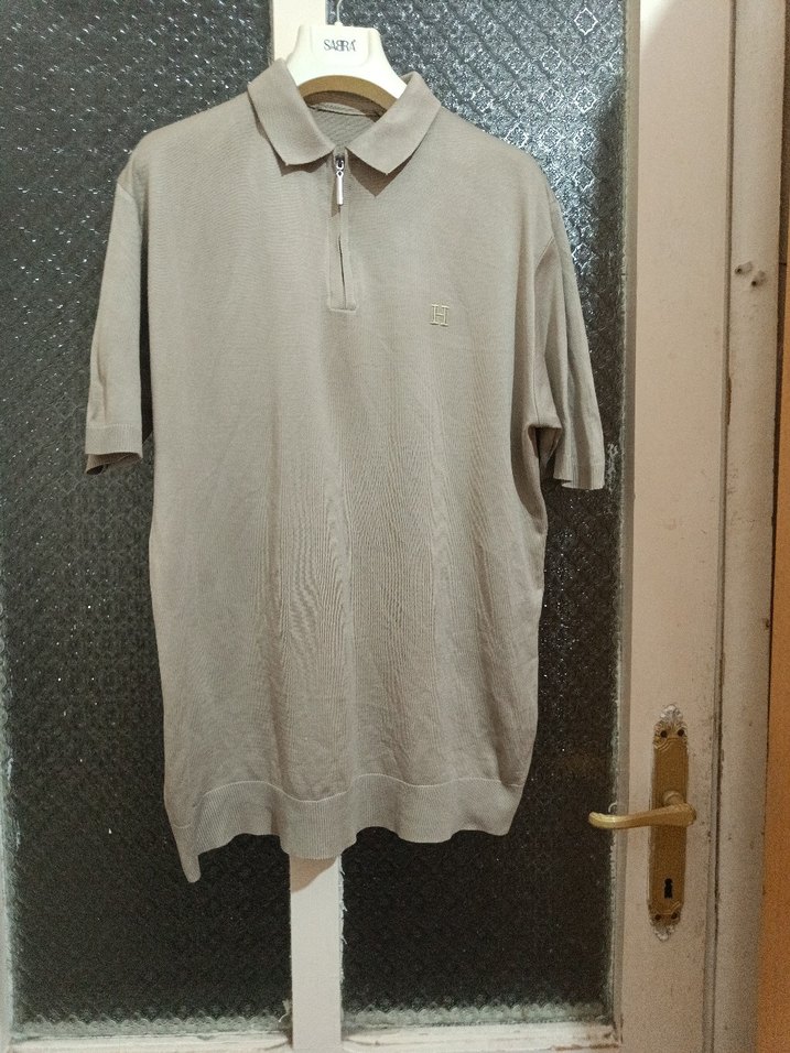 Kısa kollu, fermuarlı yakalı ve bol kesim bej keten erkek polo tişört. Günlük kullanıma uygun rahat ve şık bir tasarım.