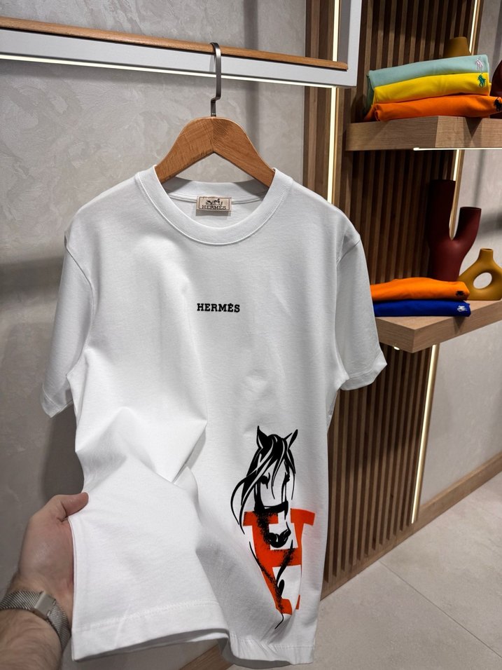 Beyaz Hermes erkek tişörtü, kısa kollu, yuvarlak yaka ve bol kesimlidir. Baskılı at figürü ve logo detayları bulunur, yumuşak sentetik kumaştan üretilmiştir.