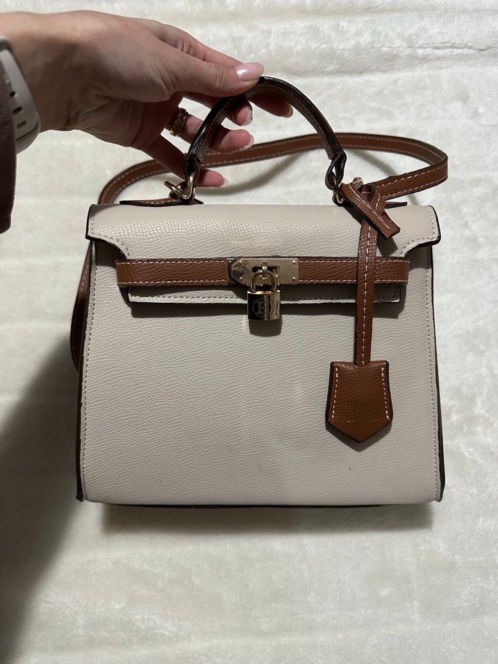 Bej deri, bantlı kapamalı ve baskılı desenli kadın çantası, günlük kullanıma uygun modern klasik tarzda. Sıfırdır hiç kullanılmamıştır.