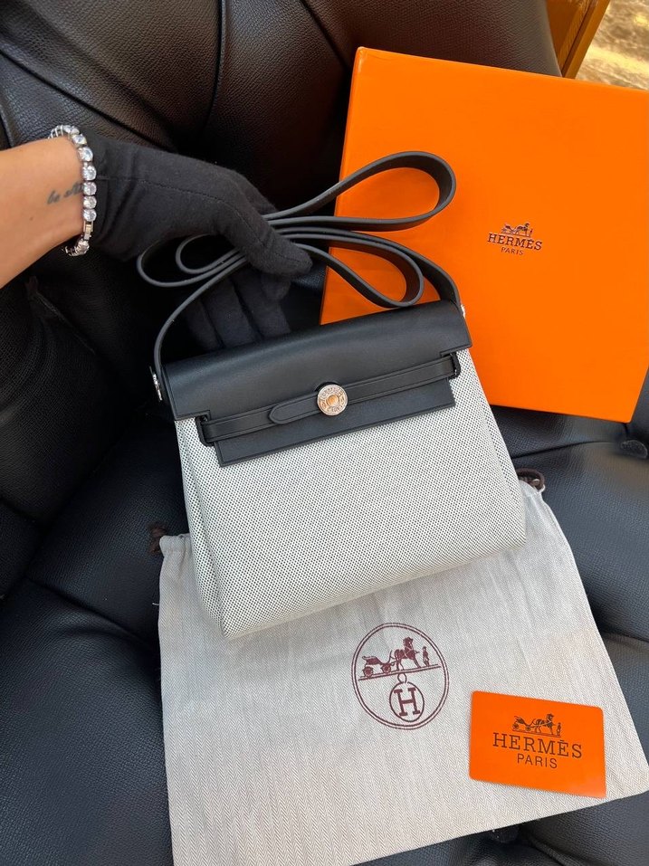Hermes marka, gri baskılı sentetik kumaştan yapılmış, kemerli detaylı ve siyah aksanlı kadın çantasıdır. Sokak stili ve dış mekan kullanımı için uygundur.