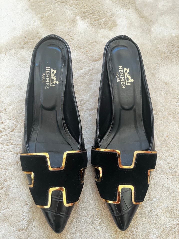 Hermes markalı siyah kadın terlik, blok topuklu ve tokalı tasarıma sahip, ofis kullanımı için desenli detaylar içerir.