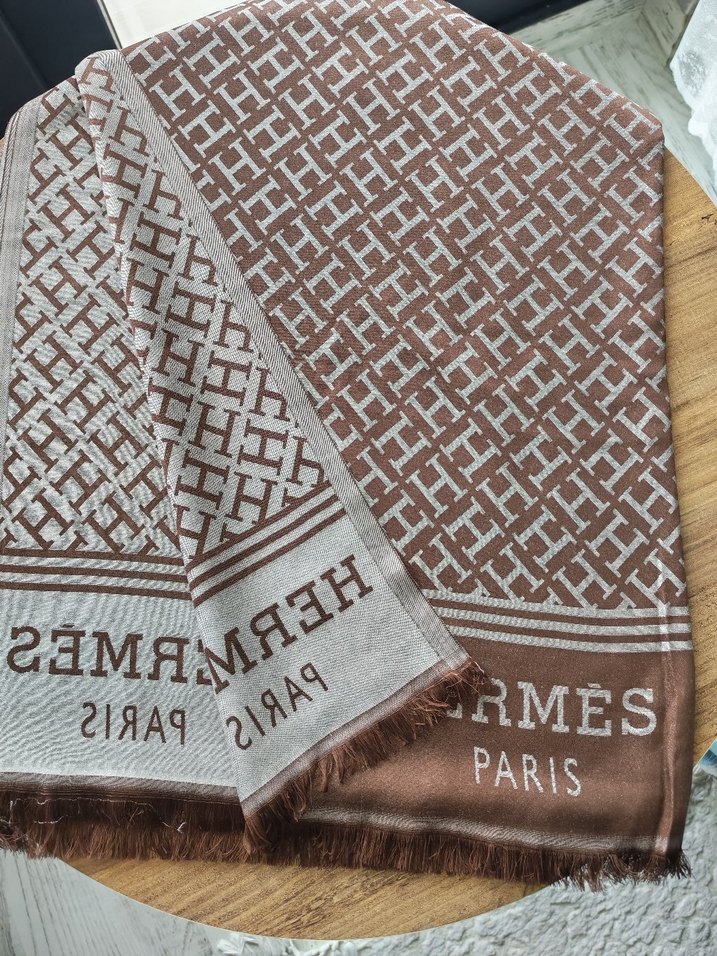 Hermès marka kahverengi ve gri renklerde, viskon kumaş şal.Şıklığı seven bayanların tercihi, rahatlığı ve konforu aynı anda yansıtan şal Hermès Paris logosu H deseni bulunur.